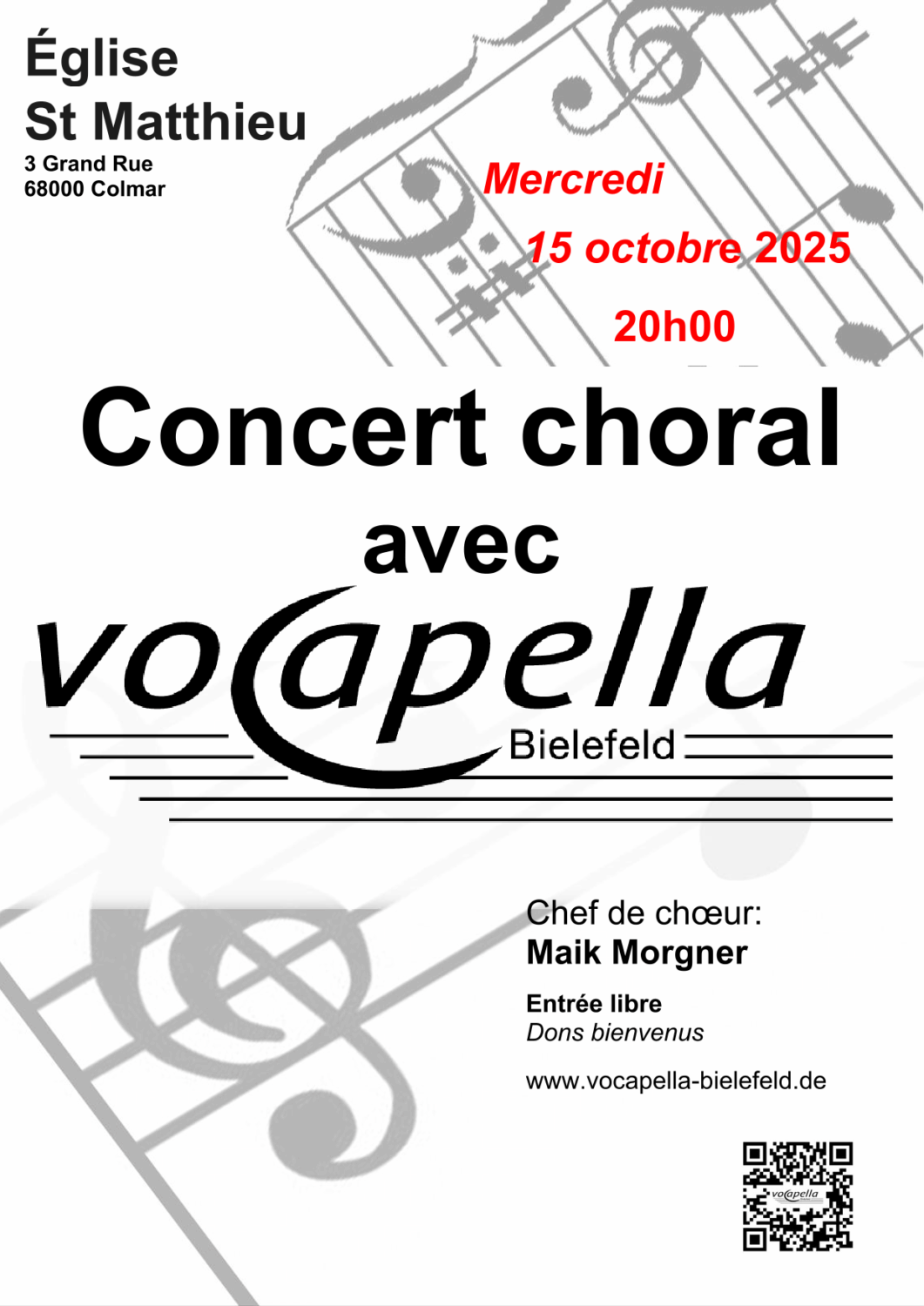 Wir freuen uns auf unsere Chorreise ins Elsass! Wer zufällig auch dort ist, kann uns am 15.10.2025 um 20:00 Uhr bei unserem Konzert in der Église Saint-Matthieu de Colmar,